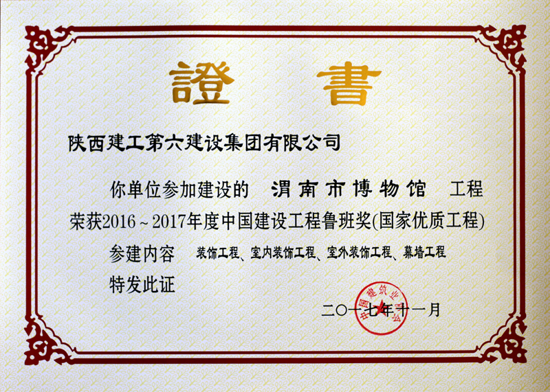 11月6日,中国建筑业协会在北京钓鱼台国宾馆隆重召开纪念鲁班奖创立30周年暨2016~2017年度创精品工程经验交流会。会议对238项荣获2016~2017年度中国建设工程鲁班奖的工程进行了表彰,我集团承建的沣西新城总部经济园综合楼和参建的渭南博物馆两项工程双获殊荣,集团董事长、党委书记李继涛等一行赴京参会并为集团捧回第六个鲁班奖。
