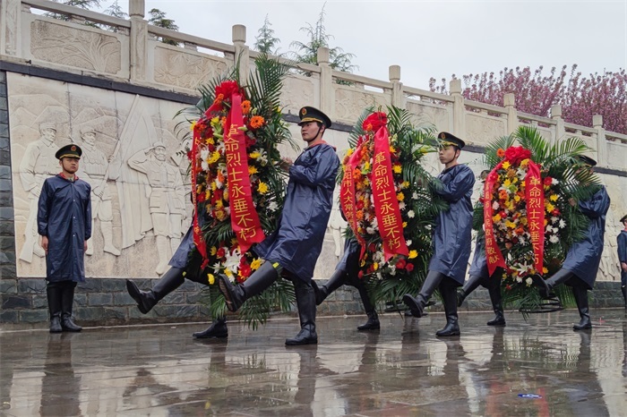 当天上午,细雨含悲,山河肃穆。参加祭扫的各界代表不顾细雨霏霏,在革命纪念碑前庄严肃立,深切追思和缅怀革命先烈。全场高唱国歌并默哀致敬,解放军战士向纪念碑敬献花篮,少先队员齐唱中国少年先锋队队歌、退伍老兵深情致缅怀词……